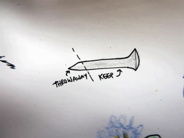 Primero vagué alrededor de las pistas con un saco de arpillera. Una vez que había recogido una docena o así picos del ferrocarril que hacer un poco de la plantilla en mi chopsaw metal así pude corté cada espiga en cerca de 20