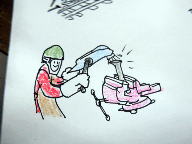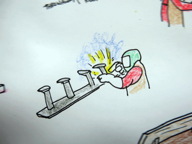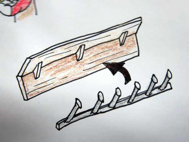 A continuación soldó con autógena los pinchos en la barra, dejando aproximadamente seis y 3/4 pulgadas entre cada punto. Descubrí entre mis pobres de soldadura y las formas contorsionadas de los clavos no sobresalgan uniformemente en la barra. Está bien, es una pieza "vintage", esto solo ayuda a la estética.