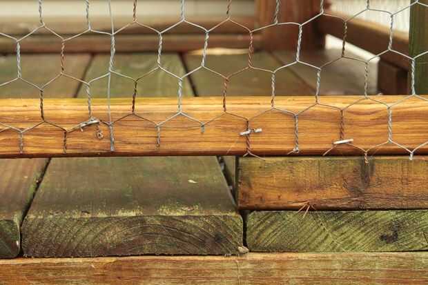 Mi diseño inicial no tenía una manera conveniente para limpiar el hábitat. Esto llegó a ser especialmente problemático en el otoño cuando conseguiría hojas dentro, o el hairball ocasional. Este verano he modificado el diseño para incluir a un corredor de 2 x 2 que es aproximadamente 2 pulgadas por encima de la cubierta. El alambre de pollo se adhiere a este corredor, no por debajo de la cubierta (como se muestra en las fotografías de hábitat mayores).