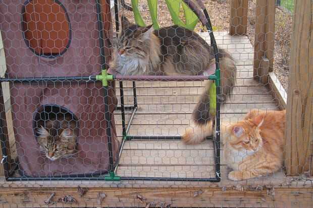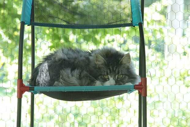 Encontramos que un modular de PVC y poliéster cat selva gimnasio es ideal para uso al aire libre. El sistema que estamos utilizando ahora es 4 años de edad. Creado en abril y hacerla caer en noviembre. Compramos dos "Multi Cat Jungle Gym" s (todavía disponible en blanco) y combinado. Encontramos que las hamacas de poliéster sólidas lugar agua de lluvia lo ahora solo usamos las hamacas de malla exterior. Encontré que Kitty ciudad cuenta con un sistema modular pero no veo malla tipo de hamacas.
