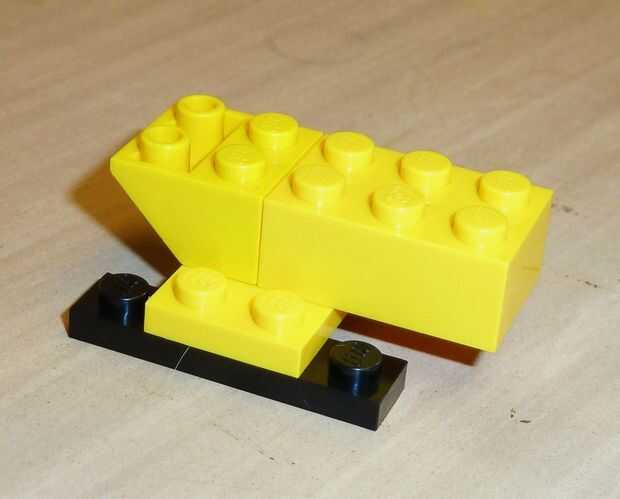 Forma la base del helicóptero uniendo un vértice amarillo al frente de la pieza amarilla plana de (2 x 3). Luego, coloque una pieza amarilla (2 x 3) a la parte posterior de la base plana de amarillo de (2 x 3). Ambas piezas que forman la base deben estar en consonancia con uno con el otro y directamente entre las piernas de dos helicópteros.