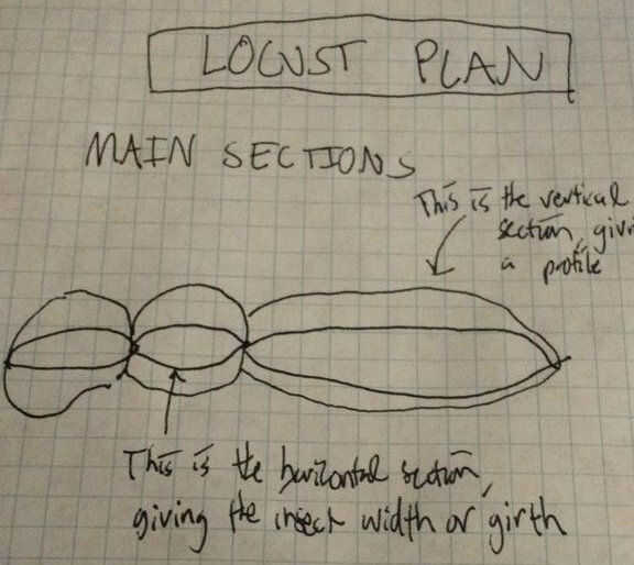 Mayoría de los insectos tienen muchos segmentos del cuerpo, así que empieza por determinar lo que los busque como el error que usted elija. Decidí hacer una langosta para este proyecto, y de mirar algunos dibujos pude ver que quería hacerle con segmentos corporales 3, uno para la cabeza, uno para la cintura y uno para la parte trasera larga debajo de las alas.