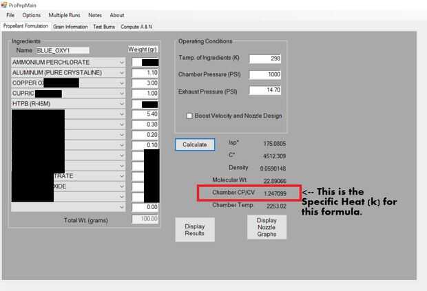 Para diseñar una boquilla óptima allí son algunas de las piezas de información que son necesarios. Primeros detalles del propulsor para ser utilizado deben ser conocidos. Esto incluye su "Calor específico" y la densidad teórica. El propulsor tendrá que han sido previamente caracterizados para obtener promedio ISP coeficiente tasa de quemar y quemar tasa de exponente. Para más información sobre la caracterización de motores cohete y adquisición y procesamiento de datos de prueba de quemaduras por favor ver mi Instructable sobre ese tema. Que los datos es utilizados por BurnSim para el diseño de un motor de vuelo. El calor específico de la "cámara de CP/CV" de la fórmula también es necesario para el diseño de una boquilla.