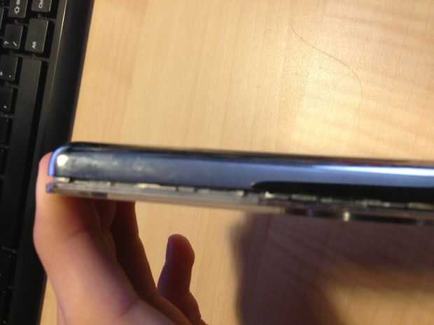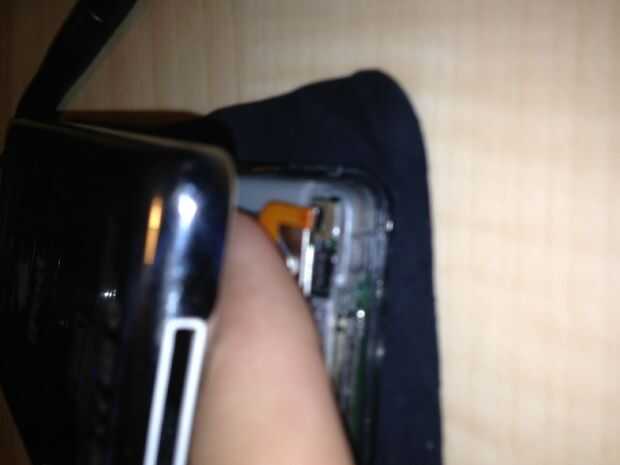 Ahora que tienes uno de la cinta cables de la parte trasera conectada, voltee el panel posterior en el panel frontal. Mantenga la parte trasera 3/4 de pulgada por encima de la parte frontal del panel. El cable de cinta final debe colgando hacia abajo, justo encima de la ranura cosita. Esta es la parte más difícil. Ahora tome usted un par de pinzas y tire de la pieza de plástico marrón hacia arriba suavemente. Sólo va a subir un poco. Ahora deslice el cable en su lugar con la tercera mano (o el pulgar de su mano sosteniendo el panel posterior), luego empuje hacia abajo la pieza de plástico marrón. Tire el cable con cuidado para asegurarse de que esté firmemente en su lugar y luego junte la parte trasera y el panel frontal hasta que encajen cerrado.