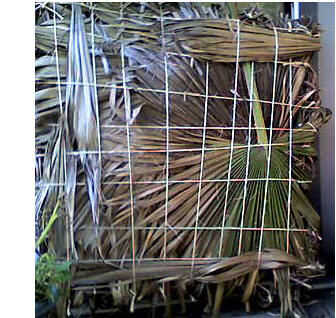 Frawns de árbol de Palma fueron utilizados para cubrir el tejido vides de uva y atadas con cordeles. Si no tienes acceso a una palmera, luego hojas de platanera o ave del Paraíso funciona bien también. Si no tienes acceso a ellos, la paja es su siguiente opción.