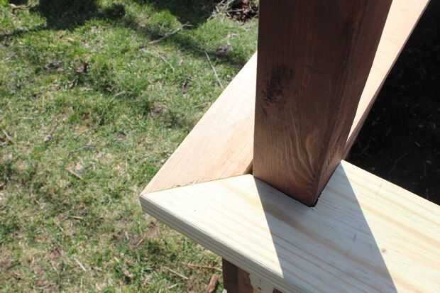 Pensé que sería instalar un pasamano superior para hacerlo más decorativo. Esto requiere más tiempo juntas a montar en los tableros de 10' y 6'. Cortar los extremos en un ángulo de 45 grados y luego hizo una muesca de 3 5/8" en cada extremo. Una vez casado y con la otra barandilla, esta muesca rodea el post. Usé las cuñas y madera masilla para hacer todo al ras e incluso.