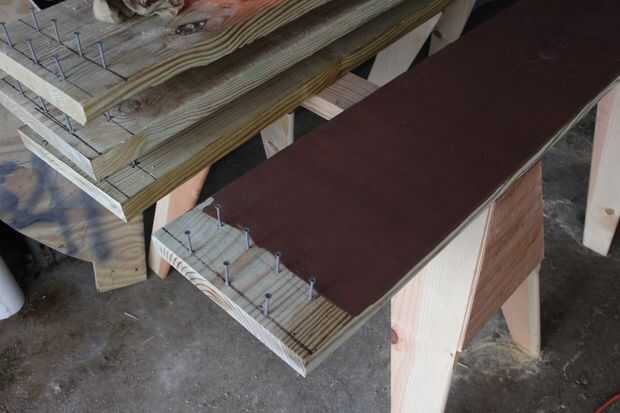 La mancha que utiliza requiere dos capas. Decidí aplicar la primera capa a los exteriores de los tableros, ya que sería difícil de manchar algunas zonas una vez montados. También perforados previamente los tornillos en las juntas en un patrón simétrico para eliminar conjeturando durante el montaje.