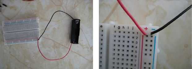 Conecte el soporte de la batería en un lado de la protoboard. Su polaridad, cable negro es negativo (-), cable rojo es positivo (+).