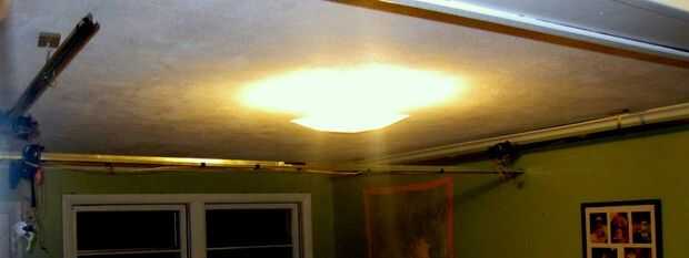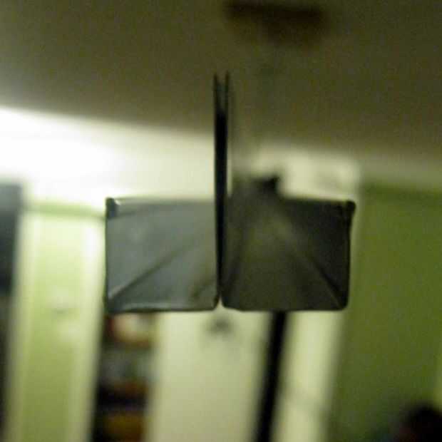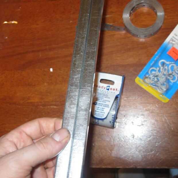 -Colocar 2 ganchos de tornillo en el techo, uno en cada extremo de la esperada X las pistas-Cortar 4 piezas de cinta de fontaneros, 6 pulgadas de largo