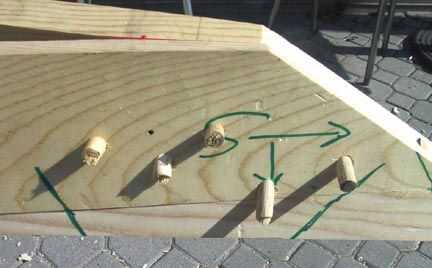 PEG la borda termina usando pasadores de 5/16 pulgadas en pulgadas 19/64 agujeros. Utilice 6 pasadores para el arco y 5 para la popa. No ponga cualquier clavijas a través de las canalizaciones verticales. Como antes, cuando usted espigas, taladro y conducir uno pasador al mismo tiempo. Resistir la tentación de perforar todos los agujeros a la vez.