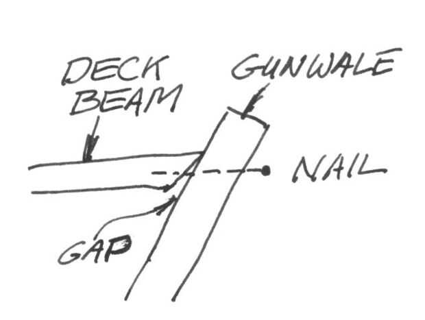 Tenga en cuenta que la parte superior de la viga de cubierta debe quedar unos 3/4 pulgadas por debajo del borde superior o el borda. Puede mover la viga de cubierta ligeramente hacia adelante o hacia atrás si se sienta demasiado alto o demasiado baja. La única excepción son deckbeams 4 y 7, la ortesis de pie y soporte posterior que debe ser situado exactamente donde se les marcaron.