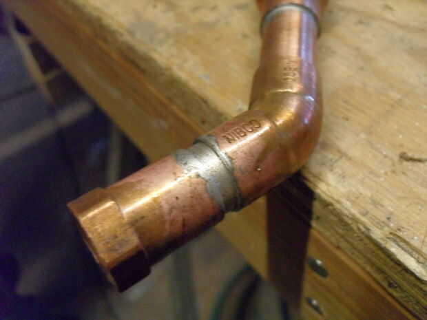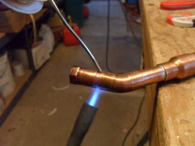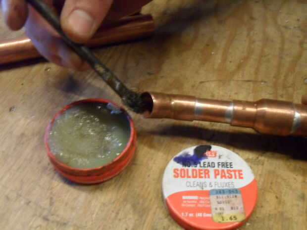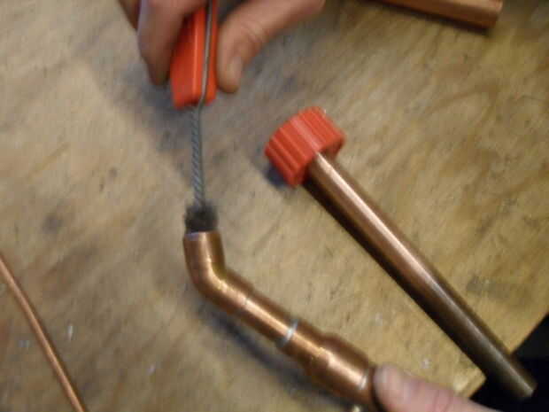 Si nunca has soldado cobre antes, sugiero a partir de las columnas que terminarán vertical, ya que estos no implican articulaciones no estándar. Use los cepillos comunes para limpiar las zonas a unir. El cobre debe ser brillante y brillante antes de que la soldadura. Utilice el cepillo de flujo para flujo se aplica a todas las superficies que desea enlazar con soldadura. Esto significa que el interior de la guarnición y el fuera de la tubería. Luego coloque el tubo dentro de la instalación, asegúrese de que va todo el camino. Coloque la pieza en un tornillo de banco (envuélvalo en una toalla para evitar marcar el cobre hermoso) o en el borde de una mesa. Recuerde, este cobre a punto de conseguir muy caliente.