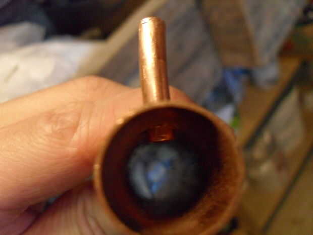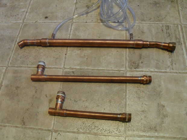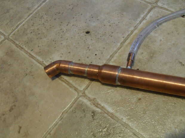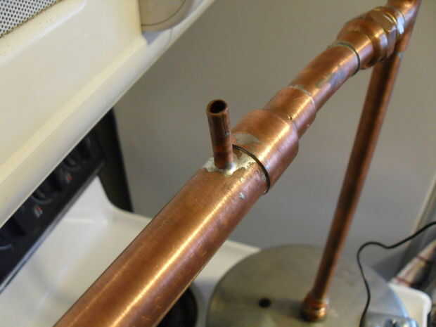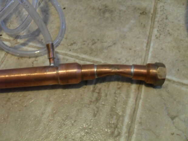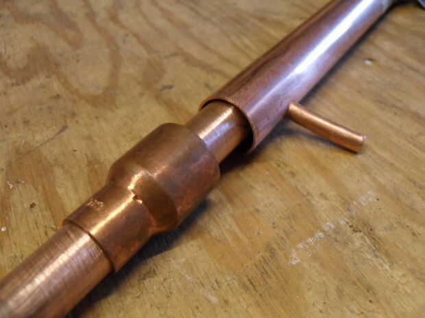 El condensador es el más complicado. El 18" largo 1/2" tubo reside en el interior de la tubería de 3/4". La tubería de 1/2" es una pieza continua con el tubo de 3/4 forrado concéntrico alrededor de él y en su lugar por los adaptadores de 3/4" x 1/2". Hay muy poco espacio entre las paredes de la dos tubería por diseño. Es esencial que agua pueda fácilmente el flujo a través de este espacio entre las paredes de dos tubos. Esta envoltura externa del líquido de enfriamiento es el que permite el aparato entero ser tan compacto. Problemas surgen en conjunto porque el agua se introduce a la cámara por los tubos de cobre de 1/4". Si el 1/4" las rebabas o el 1/4" tubo de perforación sobresalen demasiado lejos en la cámara, restringirá el flujo de agua de enfriamiento por contacto con la superficie exterior de la tubería de 1/2". Utilizar el archivo para reducir el tamaño de las rebabas (bueno un poco allí para ayudar en el proceso de soldado) y asegúrese de que cuando se suelda el tubo apenas va más allá de la parte interior pared de la tubería de 3/4".
