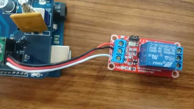 2 Conecte el circuito: conectar DC + del relais con los 5V del escudo. Y DC - con el GND del escudo. Luego conecte la IN del relé con el puerto de IO de escudo y estas tres líneas con la Servo_Grab de escudo por línea femenina de Dupont.