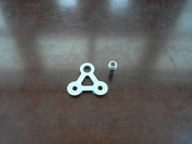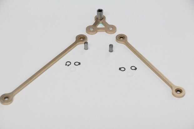 Luego conectamos los tres ejes con el triángulo a parte. En primer lugar, añadir el φ6 * eje de 9 mm para la conexión de triángulo parte y agregar la manga a la parte de vinculación. Se debe tener cuidado con la dirección de la manga. En segundo lugar, añadir una arandelas de nylon de 0.7mm para el eje. En tercer lugar, respectivamente agregar el eje con los bujes A y B a la parte enlace y debes tener cuidado de la dirección de los dos ejes. La dirección correcta de los ejes se muestra en la fotografía. Entonces utilizamos respectivamente dos broches de presión para fijar el eje A y B . Si usted tiene alguna pregunta, puede ver este diagrama de explosión Dobot a continuación: