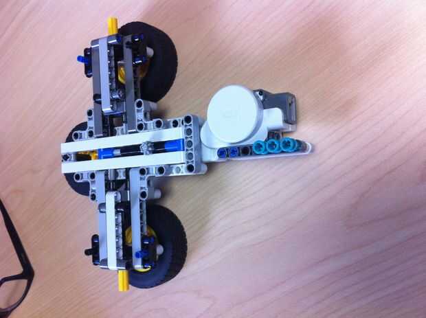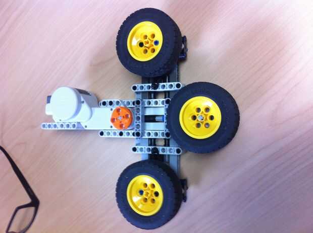 5. Sujete las ruedas y el conjunto de Servo a la parte inferior de la Base como se muestra.