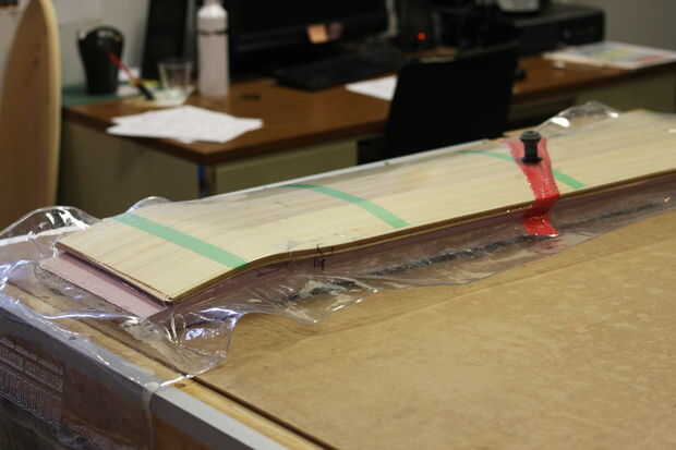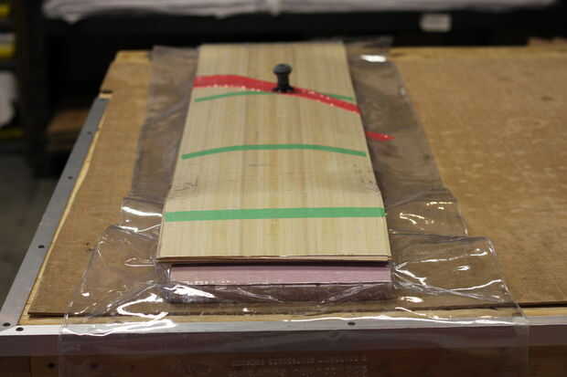 Consejo: Usted notará que hay líneas de verde cinta adhesiva a lo largo de la anchura de la lámina superior de bambú. Esto se hace como una medida adicional para evitar que el bambú de la división a lo largo de una de sus muchas costuras. Bambú se hace de muchas tiras de material empalmado hasta unos a otros, y porque el material es tan delgado, tiene una tendencia a ser frágil a lo largo de las costuras longitudinales. Mientras que la chapa no necesariamente rompe sin este refuerzo con cinta, nos han tenido éxito con él hasta ahora y continuará tomando este paso adicional en nuestras tablas.