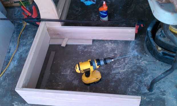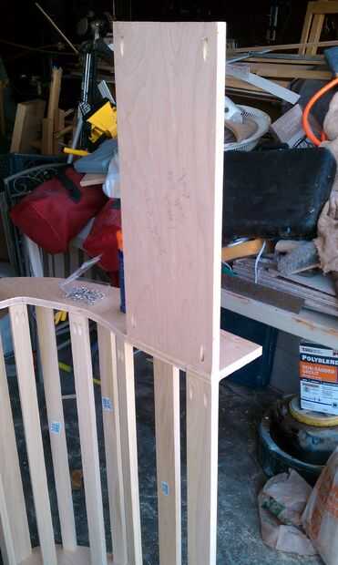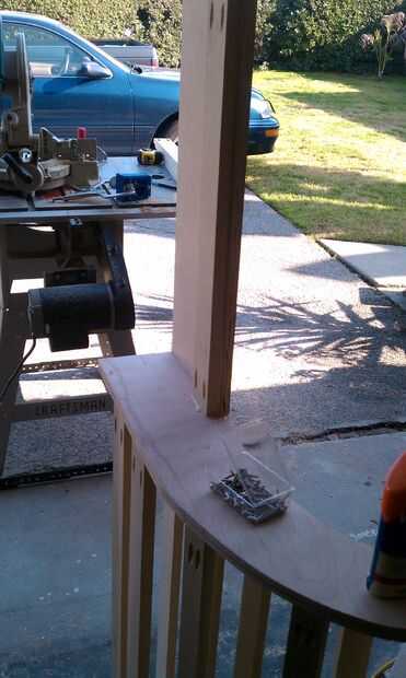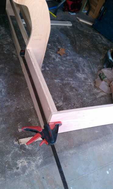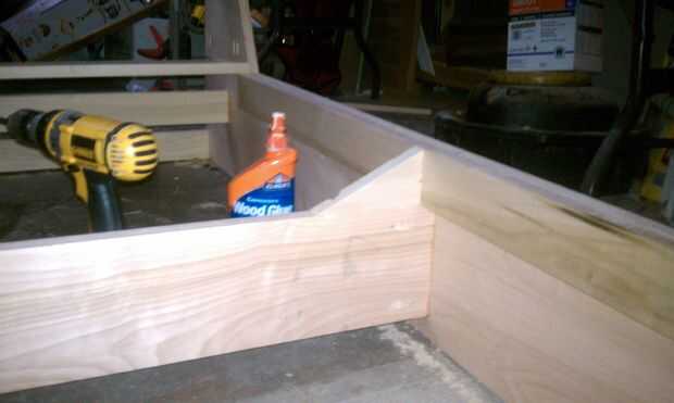 Primero fijar el riel de Chaise lado al frente de la cara del brazo. Entonces Afiance el tablero de aguijón en el interior del riel lateral Chaise. Dondequiera que la madera toque madera allí es pegamento.