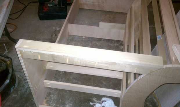 Respaldo es 18" de alto y 12" de ancho. El borde superior es 2 1/2" de ancho y se corta diagonalmente en el borde inferior de la pieza de madera contrachapada para obtener el ángulo derecho. Fije a la parte posterior de la baranda del lado de chaise.