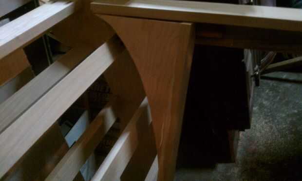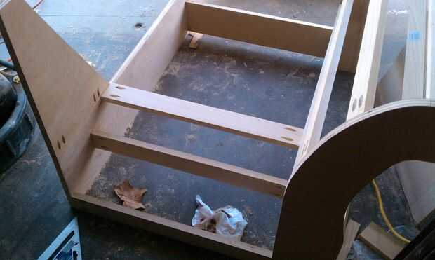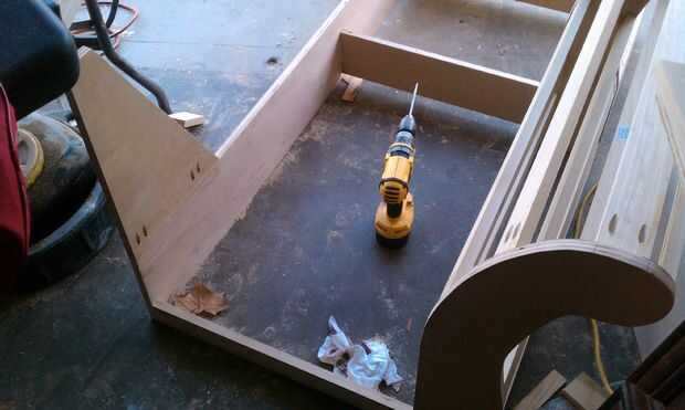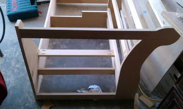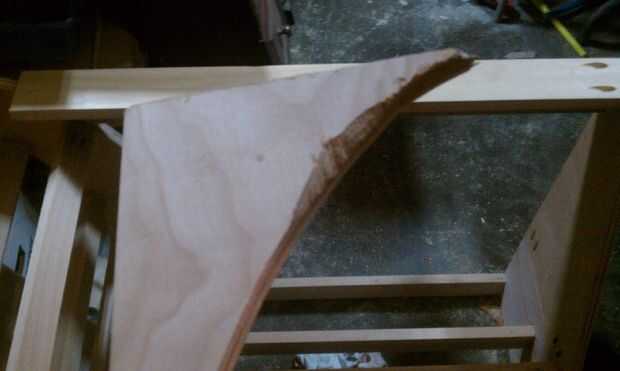 Utilicé una pinza en la parte exterior del brazo y el panel de soporte de espalda para mantener la distancia de 36". Luego coloca el riel de soporte trasero Horizontal superior (C-4) en el interior del panel respaldo 3/4" abajo y presiona contra la parte posterior del brazo. Trazado la curva del brazo para conseguir un ajuste perfecto. Había cortado con una sierra de calar.