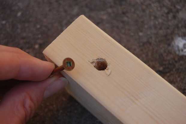 Fije las piezas con tornillos de construcción o cubierta larga 2.5" o 3". Puesto que usted va conduciendo tornillos en los extremos, a través de las tablas 3.5" amplia, será necesario primero perforar un agujero contrataladrado adecuado. Utilice un tornillo por junta.