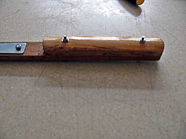 La tercera foto muestra también un pedazo corto de madera atornillado al brazo inferior. Esta pieza se reclinará sobre la escala utilizada para medir la fuerza de empuje. La longitud dependerá de la altura es su escala y está poniendo su plataforma de calibre de empuje en.