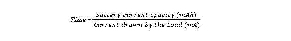 Podemos estimar cuánto durará una batería de Li-con cierta capacidad de corrientede descarga. Primero necesitamos saber la carga que va a ser conectado a la batería y luego usar la ecuación en la segunda imagen de arriba para calcular el tiempo.