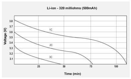 Descarga sucede cuando Li-ion se desplaza de negativo a positivo electrodos circula una corriente. Dependiendo de cuánto la carga dibuja actual de la batería, el tiempo de descargando puede variar. También, porque las baterías de Li pueden proporcionar altas densidades de energía, que tienen una curva de descarga bastante plana en comparación con otros tipos de baterías.