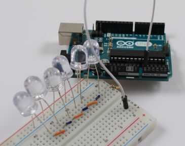 2. Coloque cada LED en la placa como se muestra en la imagen. Conectar la clavija más larga de cada LED en serio con la resistencia mientras el perno más corta a la tierra. Tenga en cuenta que los LEDs se conectan en paralelo.