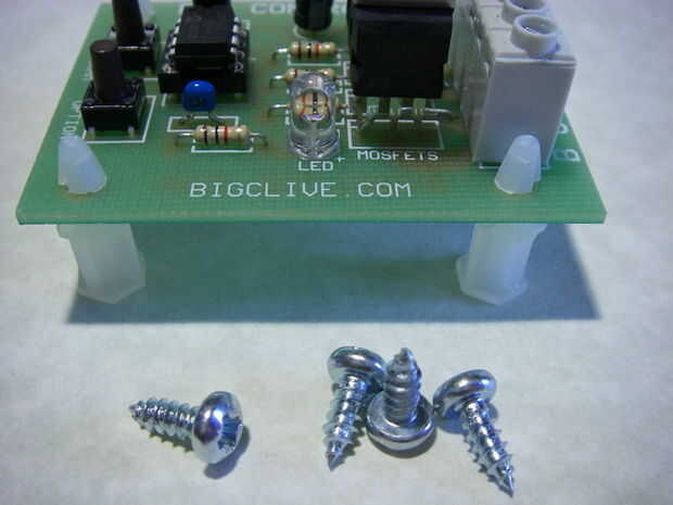 me gusta hacer mis cajas tan completa como sea posible, por lo que éste incluso viene con cuatro columnas de montaje y tornillos para que pueda conectar a un panel o montarlo en un gabinete. Incluso si usted pretende dejar hacia fuera en su banco recomendaría menos recorte los espaciadores de plástico en la PCB como se muestra. Esto ayudará a mantener la parte inferior de la PCB de cualquier bits conductoras sobre su mesa de trabajo.