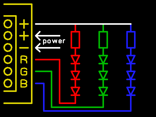 Si eres duro cableado LED o hacer tus propios paneles RGB entonces están conectados como se muestra en la imagen. Las resistencias se eligen para adaptarse a la tensión de los LEDs, pero en la mayoría de los casos puede utilizarse un valor medio. Normalmente esto sería:-
