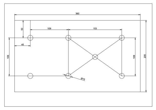 taladré agujeros de 15 mm. La distancia entre el centro de los agujeros que forma la Plaza es de 110 mm. La distancia entre el centro de los agujeros que forman el rectángulo del lado más largo del rectángulo es de 155 mm. y el agujero en el centro del rectángulo se ha colocado en la intersección de las 2 diagonales del rectángulo.