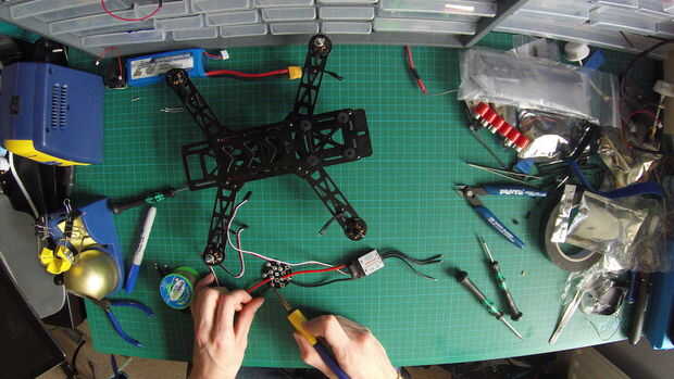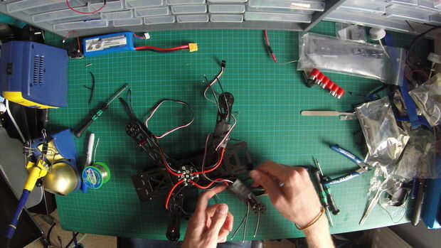 Bueno un quadcopter tiene 4 motores, que significa que necesitamos 4 controladores de velocidad electrónicos (CES) para alimentar los motores, uno para cada motor. Estoy usando un tablero de distribución de poder que se divide la energía de la batería a cada ESC. Sólo puede soldar los cables entre sí, pero usando una tabla de hace mucho más fácil y generalmente más confiable. Asegúrese de que usted consigue la polaridad correcta o usted estará seguro liberar la magia humo. También querrá volver a soldar unos cables para conectar a la batería. Estoy usando un conector de XT-60. Aseguró la Junta a la parte inferior con cinta doble cara espuma. Materias realmente útil! Utilizar abrazaderas de plástico correa los CES a los brazos y poner en orden los cables de alimentación.