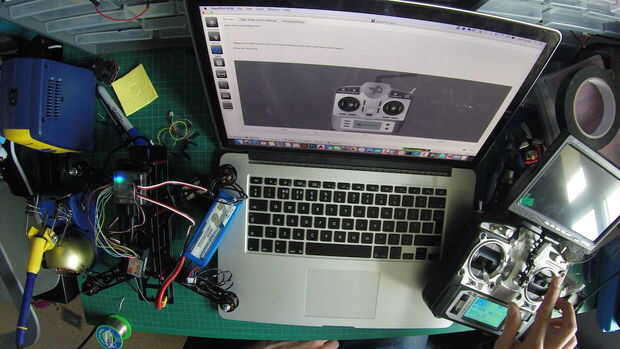 - Encienda su transmisor, haga clic en el botón verde y trasladar todos los palos y los interruptores en la emisora.