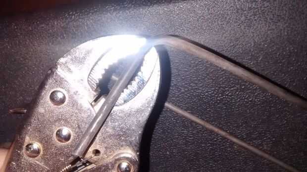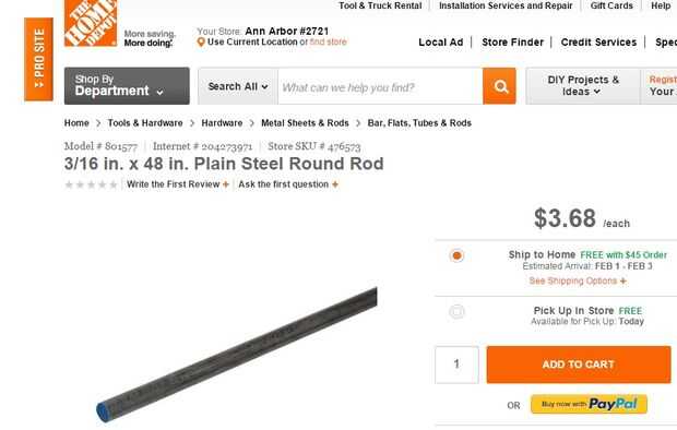 3 igualdad de longitudes (16 pulgadas) con una sierra para metales. Coger unos alicates y curva en forma de L con la parte más corta de la L 2 3/4 pulgadas de largo. (Le pregunté a los chicos de Home Depot que me ayude a cortar ahí mismo en la tienda y lo hicieron para mí. Vagó hasta la sección de herramienta y había doblado de las varillas con un par de tornillo de banco, que colocan en el estante. Para no tener que comprar una sierra de mano o unos alicates. La alcaparra todo me tomó menos de 15 minutos y el coste menos de $10.)