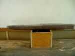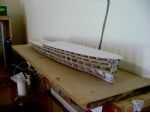 Luego se perforaron los ojos de buey y sus anillos exteriores hechos de alambre de cobre fino. Para las cubiertas de adoquín, chapa de madera de Meranti fue utilizado otra vez, corte en 1.5 ancho de x 25 mm tiras. La anchura de 1,5 mm es demasiado, pero para intentar la cubierta con las tiras del tablón sólo 1 mm de ancho por 0,7 mm de espesor sería una tarea muy larga y difícil! El casco fue luego pintado en su color final, y que era tiempo de sentarse con una cerveza o dos y admirarlo, foto 7. No absolutamente tan simple como eso por supuesto porque los árboles de hélice y timón tuvieron que añadirse así como cuidado de enmascarar para el desmoche de arranque etc, pero usted consigue la idea. Esta construcción y la pintura del casco básico toman tres meses de tiempo libre intermitente.