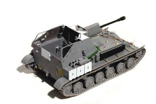 El kit proporciona el muchos apoyos pequeños guardabarros, pero decidí sustituir estos con tiras de hoja de cobre amarillo para conseguir más cercano a escala de espesor. Reemplacé la U varios en forma de bucles de estiba con los más finos de alambre, y la plaza en forma de bucles de algunas hojas de PE para kits T-34. Los clips O pequeño en la parte superior del compartimiento del combate para fijar la lona provenían algunos Tichy ferrocarril HO escala O anillos de plástico.