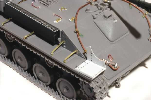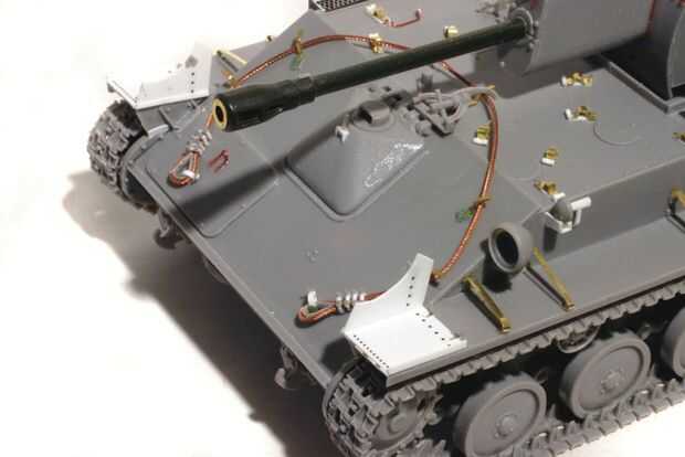 que quería el arma separada del casco para hacer más fácil pintar y el lucha interior del compartimiento y mi solución fue cortar la parte delantera de la pistola, que no se ve de todos modos. Esta manera, la parte trasera de la pistola puede dejar separada para la pintura y detalles, mientras que al mismo tiempo la parte exterior del montaje de la pistola se puede montar con el resto del casco. La única parte del conjunto de la pistola hacia adelante que debe salvarse es la parte delantera de la diapositiva que puede verse a través de la abertura en la parte inferior de la cubierta del arma blindada. También reemplacé el barril y el hocico freno con uno de un Italeri ZiS-3 porque MiniArt moldeados del freno de boca arriba a abajo que prometía ser un problema para las aberturas de mira a la derecha; Tuve un montón de Italeri kits de un espectáculo de hobby hace unos años cuando alguien vendía montones de ellos al precio regalo de 50 centavos. Sin embargo, tengo una sospecha veremos un barril de latón o aluminio dado vuelto y amordazar freno para este kit finalmente de todos modos.