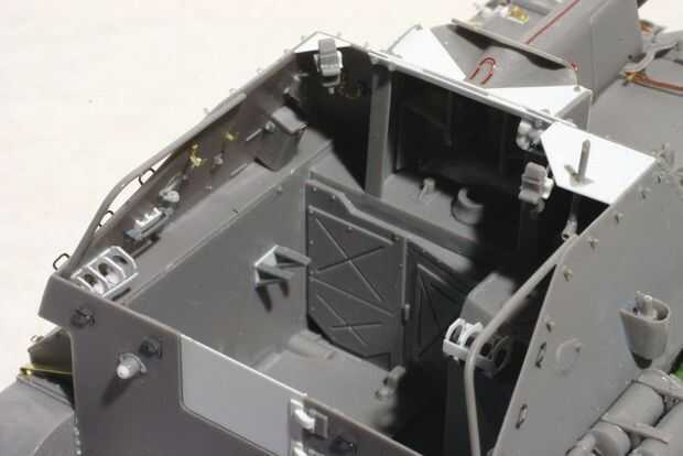 Hice una buena cantidad de cambios de pequeños detalles en el compartimiento de combate, incluyendo re-construye substancial de la munición tambor racks racks y ametralladora. Los 76mm munición estantes proporcionan el mayor dolor de cabeza como cada ronda tenía un pequeño clip de semicircular para sostenerla en lugar. Pasé un par de tardes probar varios esquemas para representar estos clips incluyendo varios intentos de vacío-formación y uso de tiras de PE, pero finalmente se estableció en el uso de tira de plástico en su lugar. Envuelve algunos.010 x.030 tú árbol de hoja perenne de la tira alrededor de una barra de cobre amarillo, sumergido en agua hirviendo y luego la apagó en agua fría para mantener su forma. Luego trocear la tira semicircular y ensamblado junto con algunos otros pequeños pedacitos como resultado en la forma final que se ve en las fotos. Dudo que muchos modelistas que desean ir a este nivel de esfuerzo, pero tal vez alguna firma del mercado vendrá con una ingeniosa manera de solucionar este problema.