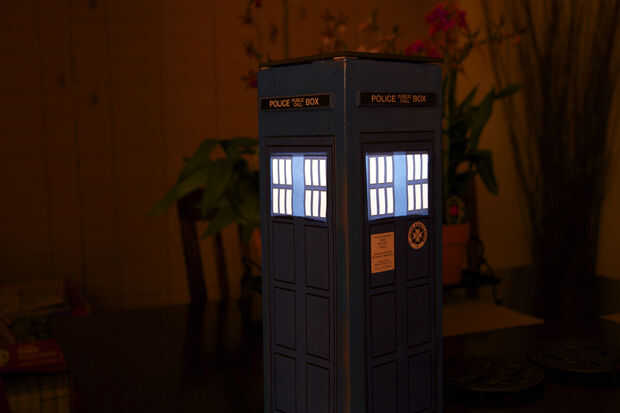 Fui capaz de encajar dos lados y pancartas de "policía pública llamada caja" extra en una sola hoja. Por lo tanto dos hojas para cada Tardis. Pensé que eso si corte un agujero rectangular para el área de la ventana, la luz se muestra a través de las ventanas. Decidí cortar la "policía pública llamada la caja" y puesto que en un pequeño trozo de azul madera pintada ajuste para agregar una mirada de "esto no es simplemente un cuadro pintado". Para la parte superior intentó llegar a una pieza de arriba para que coincida con la Tardis de la serie pero no podía llegar a algo simple. Fuimos con un cuadrado de espuma oscura de Hobby Lobby. Esto haría el montaje de la batería de nueve voltios y condujo con cinta de doble cara un proceso muy fácil. Para permitir que la batería y LED para que necesitábamos para hacer una abertura en la parte superior de la caja regular. Para simplificar esto corta las solapas superiores para que plegada sobre hay un abismo. Esto salió justo. Experimenté en un par de las cajas antes de que con nuestro método final de Asamblea. Estábamos confundidos para un poco tratando de encontrar una manera simple de hacer una base para montar las cajas. Si la cinta la parte inferior como si fuera para algo del paquete, la caja no Párate derecho. Mi esposa subió con la idea de empujar las aletas de la parte inferior en la caja y funcionó muy bien. Recuerdo que tuvimos que hacer 20 y algo que agrega 5 minutos de mano de obra será añadir más de una hora y media a todo el proyecto.