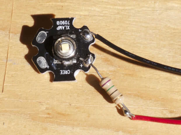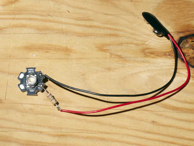 Corte los cables de resistencia para que cada conductor sea aproximadamente 3/8". Formar un lazo con uno de los extremos. Suelde el cable rojo de clip de la batería hasta el final del lazo de la resistencia. Suelde el otro extremo de la resistencia a la iniciativa "+" del LED. Suelde el cable negro del clip de la batería al "-" de lo LED. Muy simple, sin interruptor. Prueba con una batería de 9 voltios. Estas retiradas.