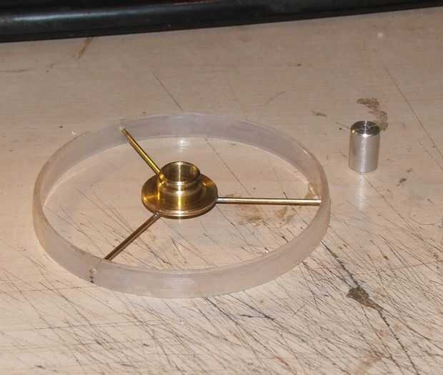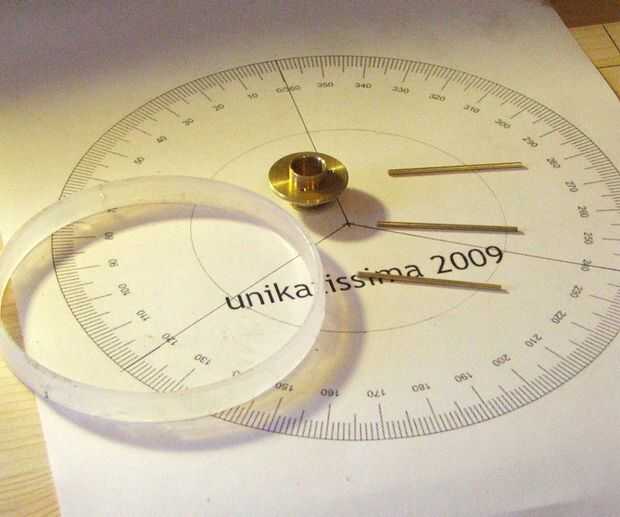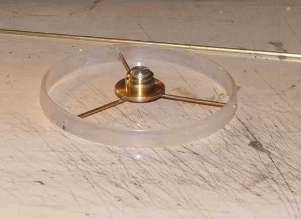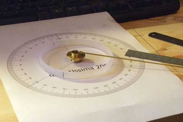 Había encontrado un casco de bronce desde un obsoleto reproductor de CD o DVD, luego he descargado una plantilla de transportador de las líneas de red y marcadas a 0, 120 y 240 grados darle tres radios iguales. Aún tenía el anillo superior de un envase de alimento que había cortar para mi primer Stirling, por lo usé como el anillo exterior del volante. Podría cortar un anillo de desagüe plástico de 3" en su lugar.