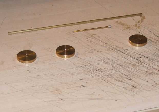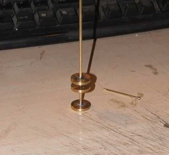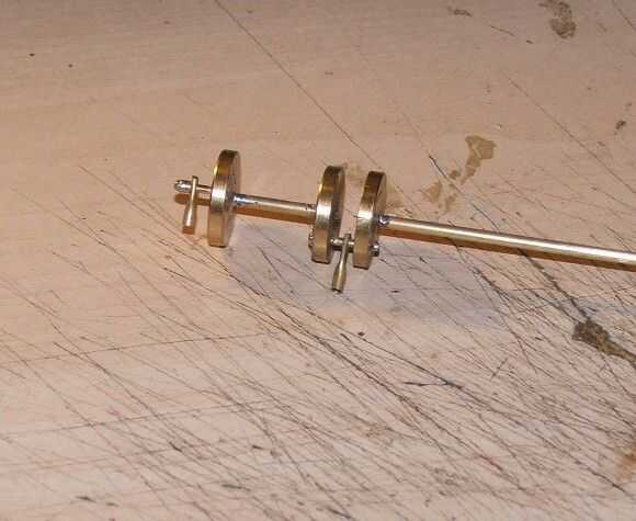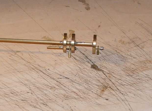 El primer disco se deslizó en un extremo del eje y soldado en su lugar. Marcó la distancia entre los cilindros (26mm) en el eje y el par de discos de la segunda manivela se resbaló en soldado en su lugar.