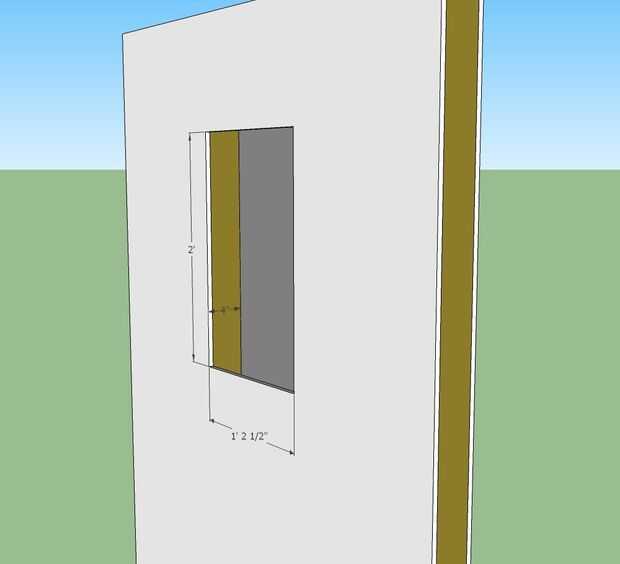 Fue sugerido por otro miembro que se debe agregar refuerzo detrás de la pared en la parte superior e inferior de la abertura. Esto se logra fácilmente cortando dos 2 x 4 a la longitud para caber entre los postes. Deslice las abrazaderas hacia arriba detrás de la pared y use un clavo oblicuo el apoyo a los montantes a cada lado.