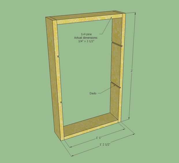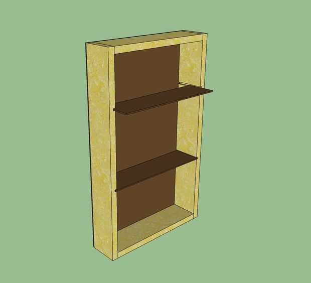 Para construir la caja, cortar las piezas. Corté las piezas laterales de la misma longitud que la altura de mi apertura. Porque quería algunos estantes, sujeta estos dos tableros al lado y corte 3/8" surcos profundos (llamados cortes de mortajas) en dos lugares separados en los tableros - véase la figura 1. Para las piezas superior e inferior, resta el espesor de ambas piezas del lado de la anchura de la abertura. Había montado la caja con algunos tornillos de drywall. Puede utilizar cualquier tipo de tornillo, siempre y cuando la cabeza del tornillo quede al ras cuando completamente asentado. No olvide perfore previamente los orificios para evitar que se resquebraje las juntas.