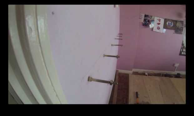 Puesto que también apoyaría la pared, tenía que ser fuerte. Perforados en las paredes de cemento para la fuerza y me adjunta un pedazo de madera maciza. Para el refuerzo, sostiene la viga sobre tres pedazos de madera sólida que funcionó a partir la tierra a la viga.