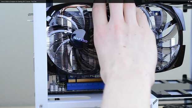 Quitar la ranura de expansión cubre en la parte posterior de la caja y deslice la tarjeta gráfica en su lugar, luego empújela hacia abajo en la ranura de la placa base hasta que clics firmemente en su lugar. Luego fijar con los tornillos de mariposa.