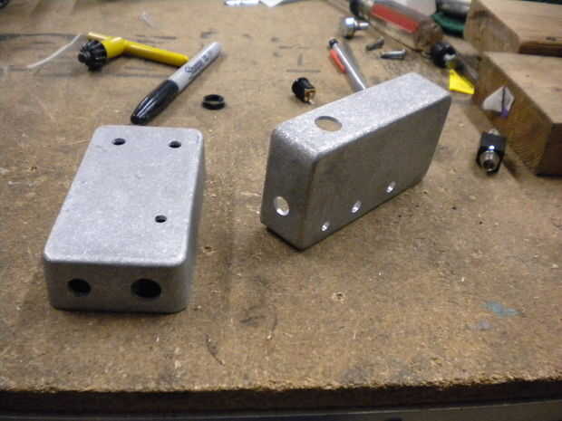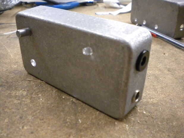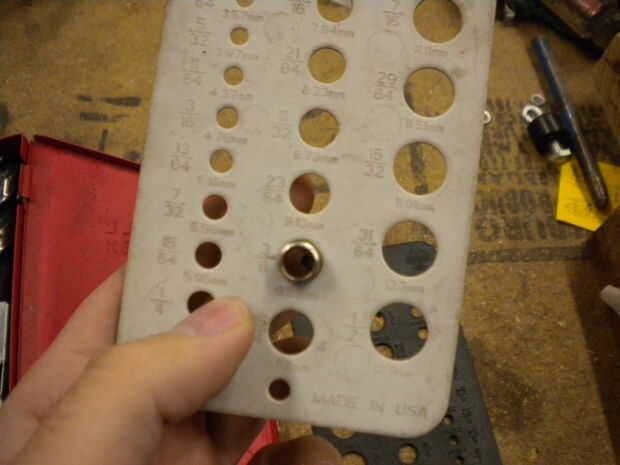 Para determinar el tamaño correcto, tomar la pieza que es taladrar el agujero para y tira de él de todas las tuercas y las arandelas, así que el hilo es en el exterior. Tomar la pieza y encontrar el índice de broca de taladro que cabe perfectamente en el orificio. Asegúrese de que es un ajuste ceñido, (pero no forzado). Una vez que averiguar qué tamaño de broca a utilizar, escriba el tamaño y su correspondiente componente. Repita este proceso para todos los componentes que se montarán en el recinto, que incluye el 1/4 audio y 9v jacks, el LED y dos potenciómetros.