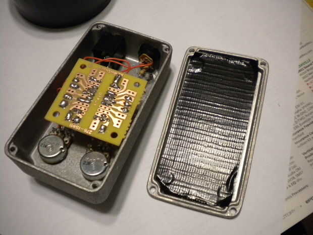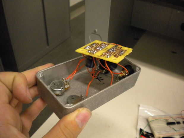 Casi ahí! Usted tiene su circuito y su gabinete listo para ir, ahora es el momento de poner todo junto. Después de soldar los componentes exceso (gatos, LED y potenciómetros), lugar de todos ellos en sus respectivos orificios y garantizar con sus arandelas y tuercas. Suavemente Coloque el perfboard en el recinto y presione para asegurarse de que todos caben.