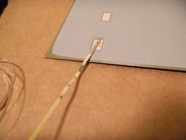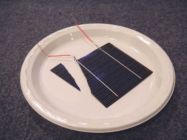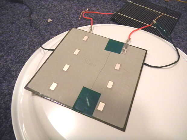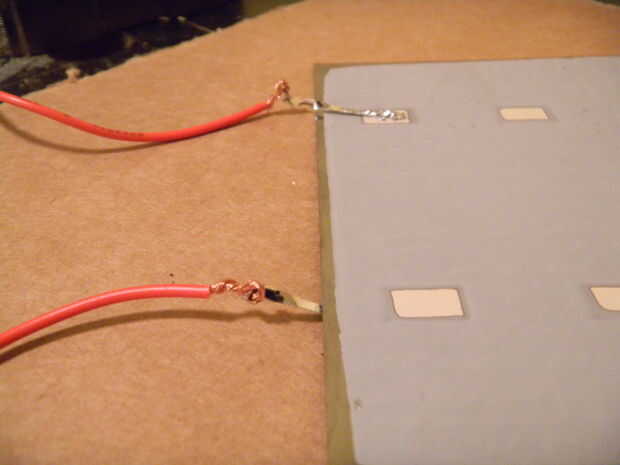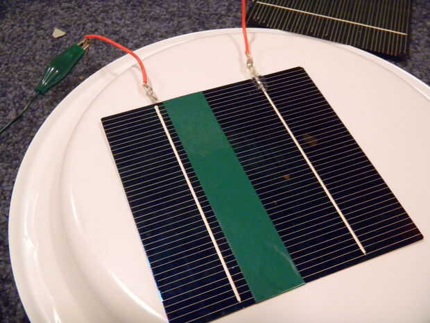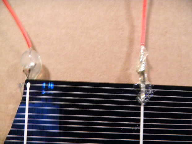 Finalmente soldar algunos cables al cable de célula solar unido a las celdas y poner pegamento caliente en el espacio donde los extremos de la célula y el alambre de la cinta comienza, aislar y fortalecerla.